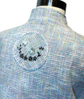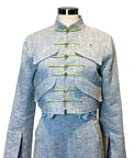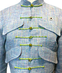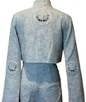 Design: Elevate your wardrobe with this refined one-of-a-kind blue cotton tweed ensemble, showcasing Japanese craftsmanship and thoughtful design details. The jacket features a contemporary mandarin-inspired neckline and closure, complemented by intricate embroidered accents at the elbows and back.